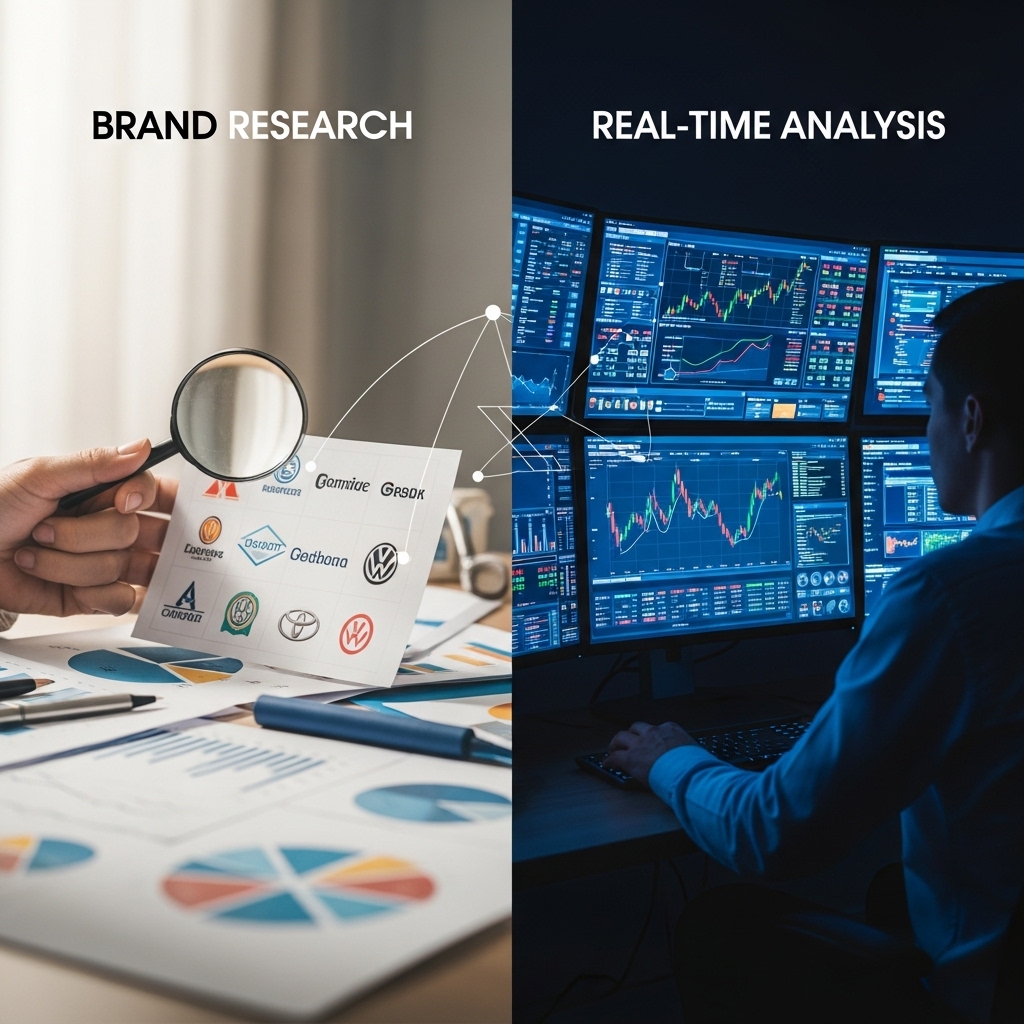 Brand research and real-time analysis involve systematically collecting and evaluating data to understand how a brand is perceived and how it performs in the market at any given moment. This process uses methods such as surveys, social listening, customer feedback, and digital analytics to track brand awareness, sentiment, engagement, and competitive positioning. Real-time analysis allows businesses to quickly identify trends, respond to customer needs, manage reputation, and adjust marketing strategies, ensuring the brand remains relevant, consistent, and competitive in a fast-changing marketplace.